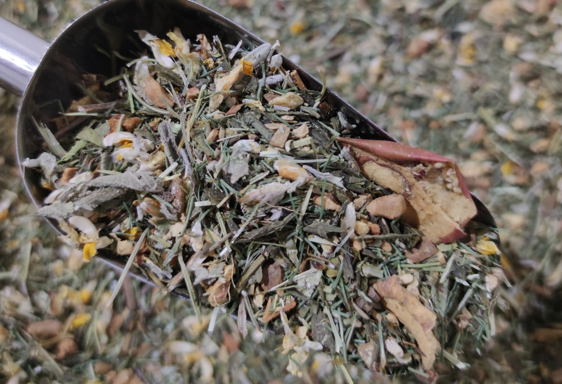 Green tea, pieces of dehydrated apple, horsetail, pieces of cinnamon, broom, ginger, sage and rosemary